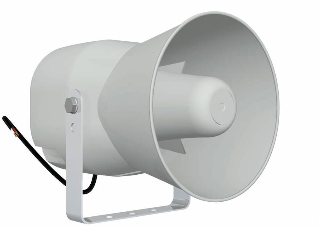 Weatherproof horn speaker 100 V transmission technology 100 V transformer with power taps on the cable 6/3/1.5 W Integrated high-pass filter for sound and stability optimisation Universally suitable for indoor and outdoor use IP54 certified White AB...