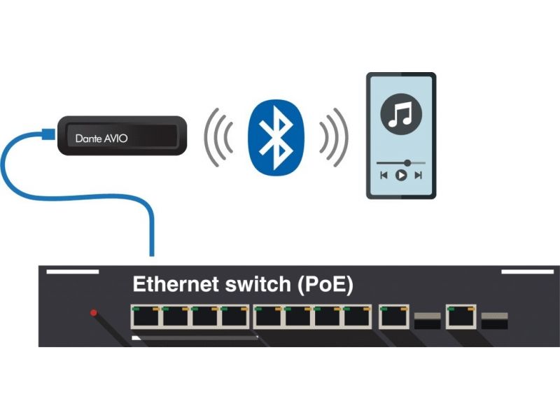 Dante® AVIO Bluetooth adapter For connecting a Bluetooth device to a Dante® audio network 2-channel recording/play Sampling rates: 48 kHz, 24 bits Bluetooth version: 5.0 A2DP (AptX, AAC) and HFP Compatible with Windows, Mac OS, iOS and Android device...