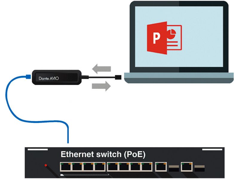 Dante® AVIO USB adapter For connecting a computer or mobile device to a Dante® audio network 2-channel recording/play Sampling rates: 48 kHz, 24 bits Compatible with Windows, Mac OS, iOS and Android devices, no driver required Connections: 1 x RJ45,...