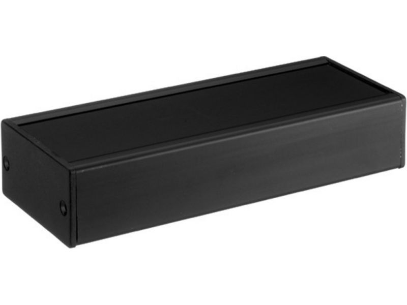 Utility Cases Extruded u-shaped profile with insertion grooves for printed circuits Exchangeable front panel with protective foil, 1.5 mm aluminium sheet metalMat black ABS plastic side covers Material surface: black Total height: 36.5 mm Manufac...