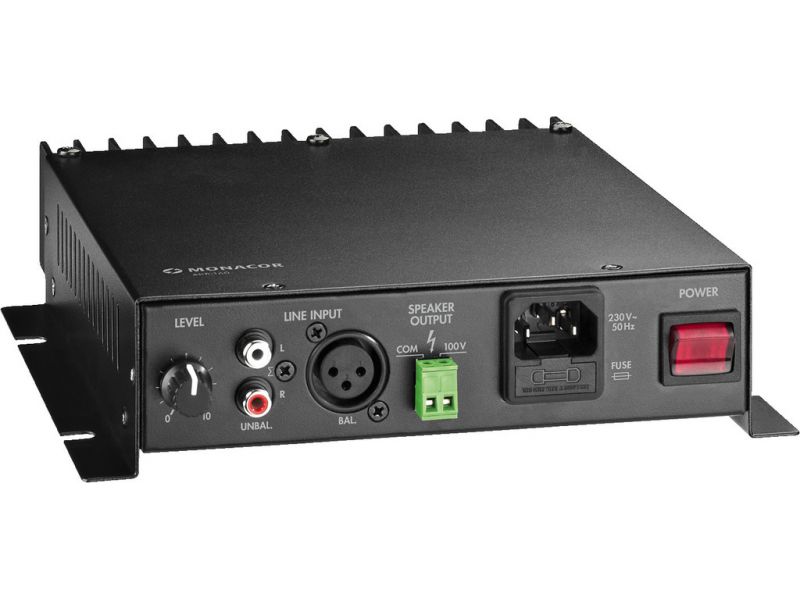 PA amplifier module, with 100 V output. 1 x 40 W Silent operation due to fanless cooling concept Balanced line input (XLR) and unbalanced line input (RCA) Speaker output via screw terminal Volume control Metal housing with mounting brackets Man...