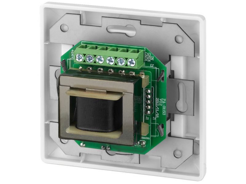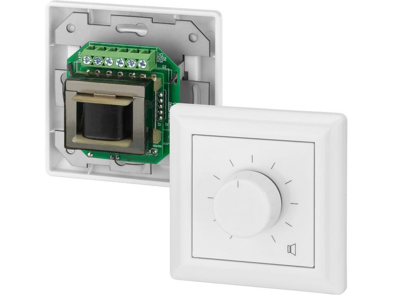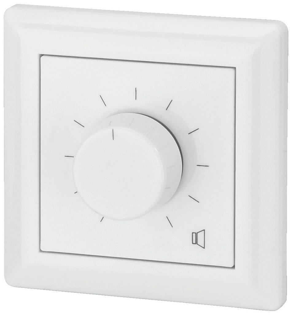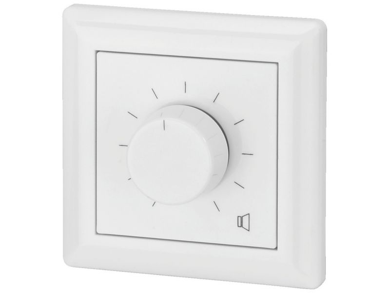 Wall-mounted PA volume control with 24 V emergency priority relay Power rating: 6 W Attenuation in 10 steps, position 0 is OFF For 100 V transmission technology White plastic front panel and knob Also suitable for already existing series of switches...