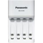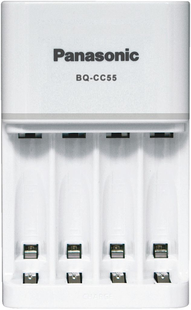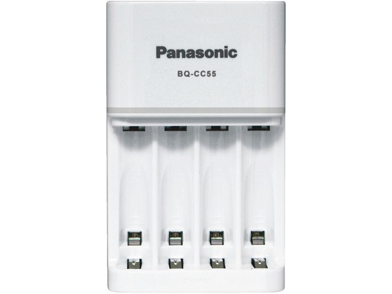 Plug-in quick charger, from PANASONIC. For 1-4 NiMH eneloop rech. batteries, AA size or AAA size Charging control for each slot Microprocessor-controlled charging control (-ΔU method) Safety timer Reverse polarity protection, temperature monitoring...