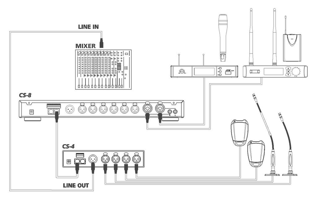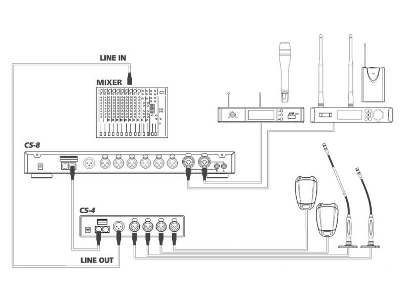 of the CS series are THE perfect aid for concepts with multiple microphones, e.g. in conference rooms, churches or language laboratories. The main task of the mixer is to open the respective microphone channel when required and to close it again when the speaker has finished the presentation. This intelligent adjustment for the individual microphone channels allows for a silent and precise control which ensures that the audience hears every single word. This greatly improves the overall sound resulting in a clear, transparent reproduction and minimises acoustic feedback and irritating background noise. The CS mixers feature a last-in function in order to maintain a pleasant atmosphere with a soft ambient sound also during the breaks in conversation rather than just cutting off the sound.