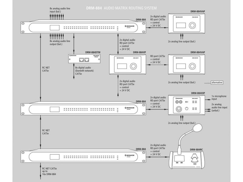 Expand your options with the matrix system: if you need a larger number of inputs and outputs, the system can be extended from a maximum of 16 x DRM-884 and optional Dante® module to 192 inputs x 192 outputs by means of cascading.