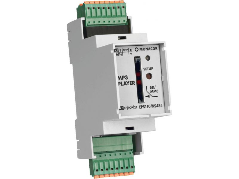 MP3 player, event-driven. For mounting onto DIN rails according to DIN EN 60715, 2 HP For SDHC/SD/MMC cards up to 32 GB (FAT32), not included in the scope of delivery Extensive playback functions 7 binary inputs In/Out string triggers RS-485 interf...