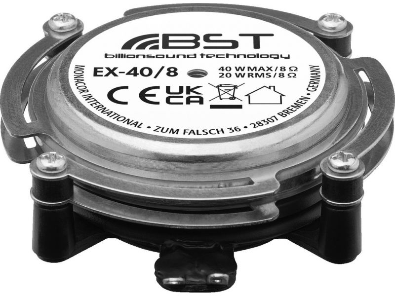 Audio exciters/resonators, 20 W, 4 Ω (/4) or 8 Ω (/8) Exciters are suitable for music and voice reproductions via surfaces capable of vibrating. They are simply glued onto doors, cupboard doors, shelves, desktops, lightweight walls, ceiling panels or...