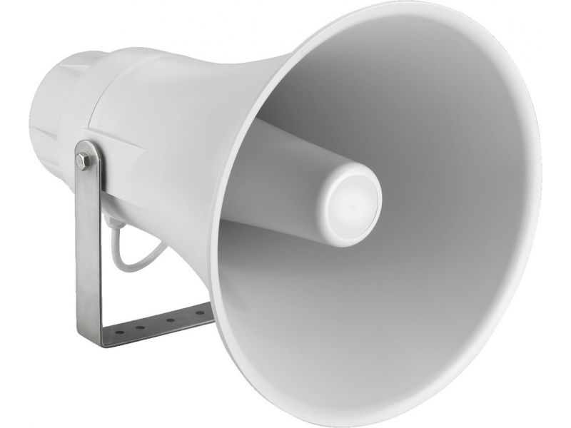 Weatherproof horn speaker, with high power capability. 100 V transmission technology Weatherproof and IP66 tested Protected against powerful water jets Suitable for general indoor and outdoor applications Light grey ABS housing (self-extinguishing,...