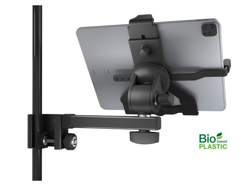 Holder for tablet PCs, with mounting clamp for stands. Universal tablet holder with a practical clamping mechanism for any tablet with an approx. size of 254-406 mm (10"-16"). The tablet holder is made of bio-based plastic. These plastics contain a...