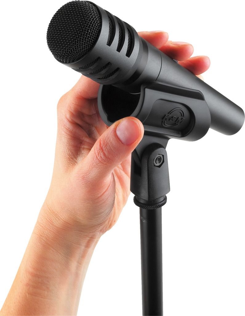 Microphone holder, Ø 34-40 mm, made of elastic plastic. Particularly suitable for wireless hand-held microphones with bigger handle Thread: 16 mm (⅝") and 9 mm (⅜") Manufacturer information: KÖNIG & MEYER GmbH & Co. KGKiesweg 2 a97877 Werthei...