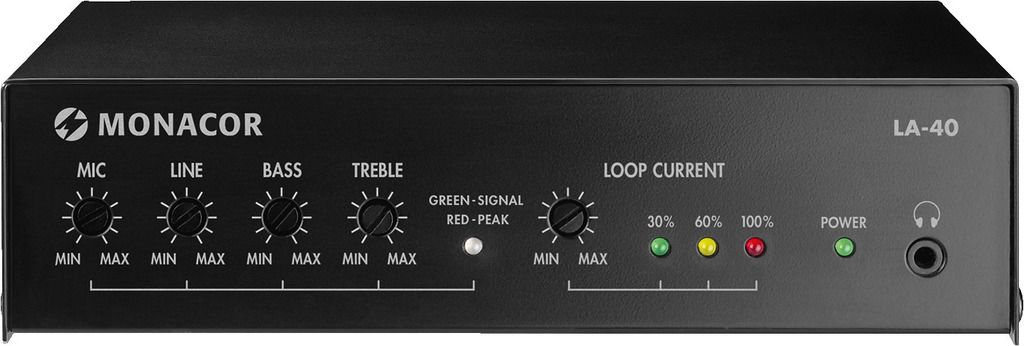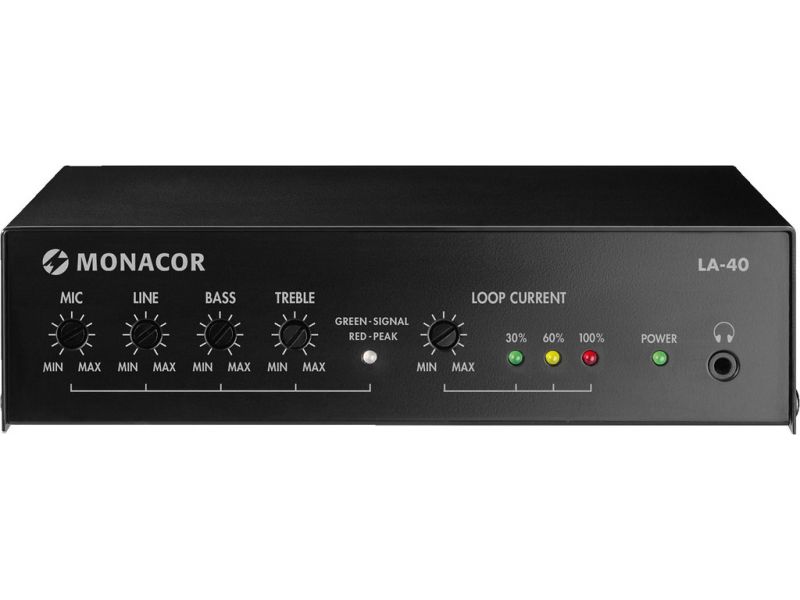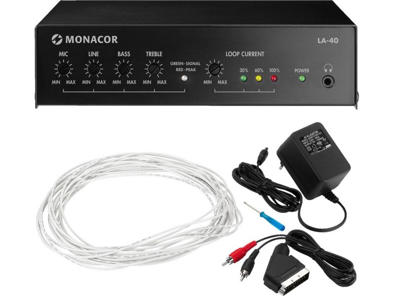 Active loop amplifier, with dynamic compressor, specifically for setting up an audio induction loop system in domestic locations (up to 40 m2). The loop amplifier LA-40 transmits the audio signals from a TV, audio system and/or microphone to the indu...