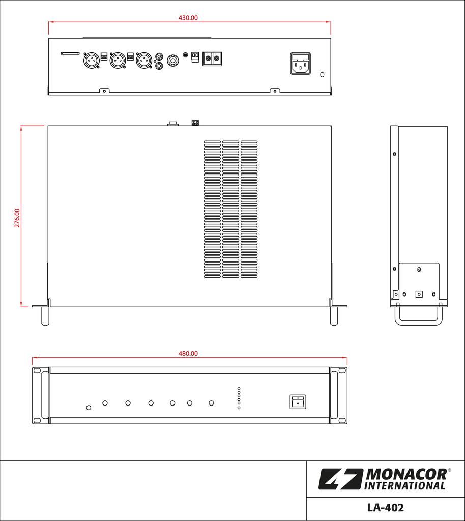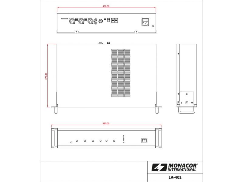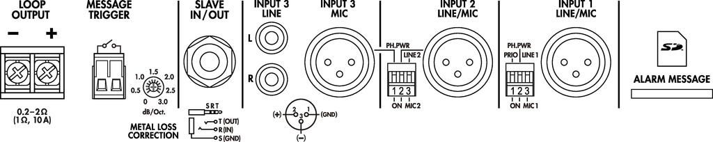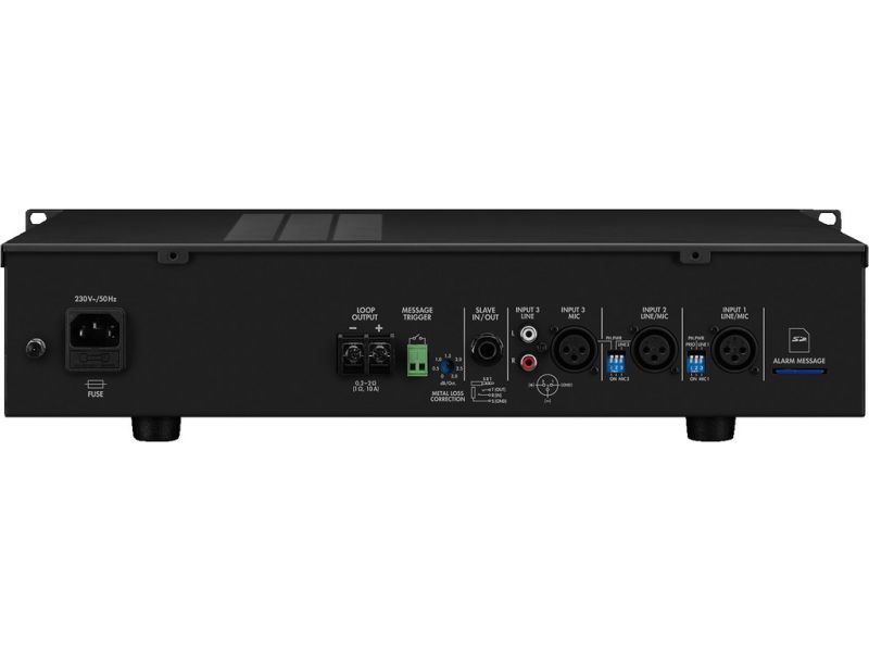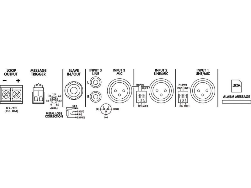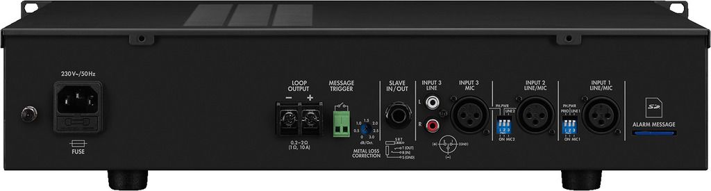 | Inputs | mic 1.5 mV/6.8 kΩ, XLR, bal. switchable to line 630 mV/10 kΩ, XLR, bal. line 630 mV/4.7 kΩ, RCA, unbal. alarm: 2 screw contacts for connecting a switch |