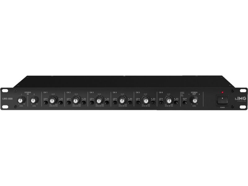 Microphone line mixer/line splitter Multifunctional device with three selectable operating modes: Mixer operation for mixing up to 8 mono input signals (6 x line/mic and 2 x line) to 1 stereo ouptut Line splitter operation for splitting 2 mono line...