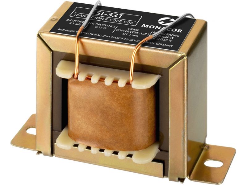 Transformer core coil, 3.3 mH High-quality crossover network coil of very high power rating, low distortion (vacuum-sealed) and minimum inside resistances, the first choice particularly for PA applications. Manufacturer information: MONACOR INT...