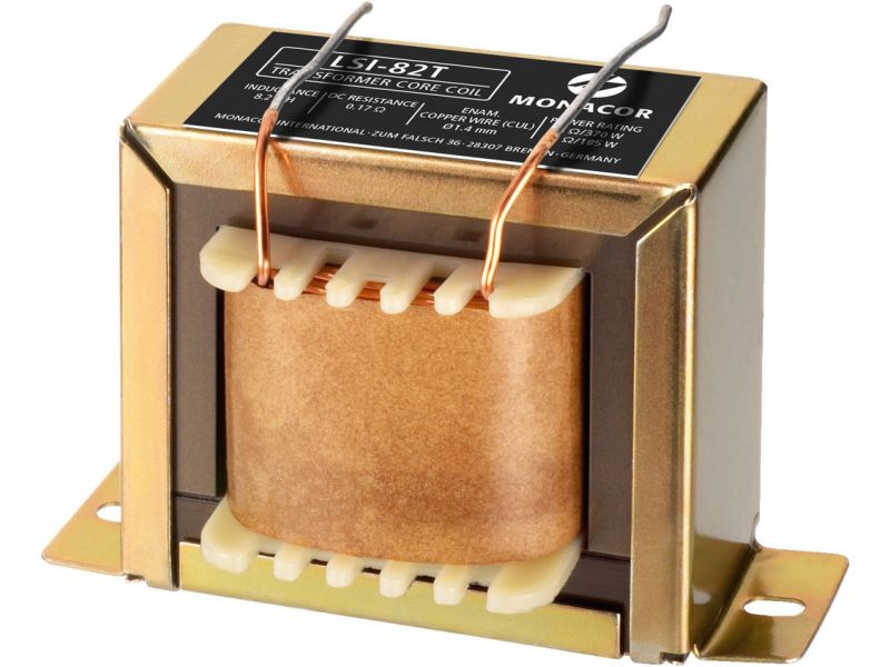 Transformer core coil, 8.2 mH High-quality crossover network coil of very high power rating, low distortion (vacuum-sealed) and minimum inside resistances, the first choice particularly for PA applications. Manufacturer information: MONACOR INT...