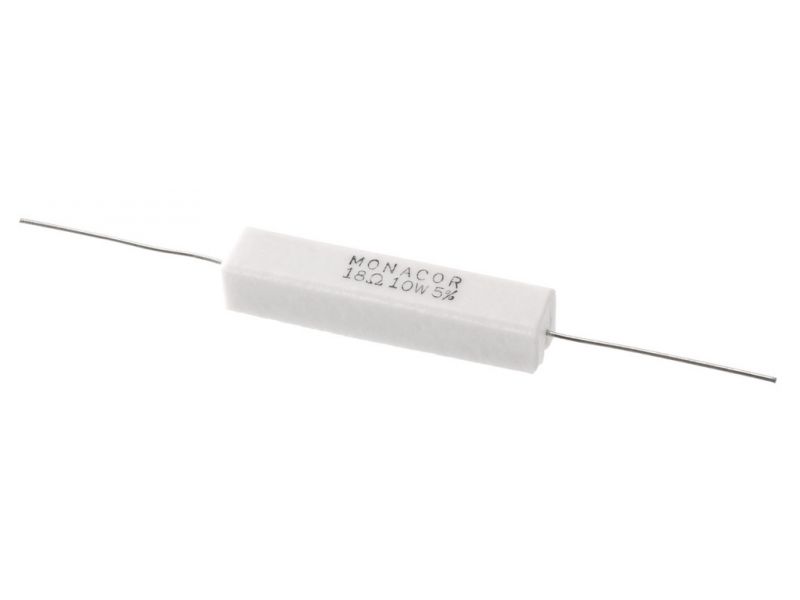 High-power cement resistor, 18 Ω, 10 W Resistor for use in crossover networks, especially for PA and top hi-fi applications, also to be connected as load resistors. Manufacturer information: MONACOR INTERNATIONAL GmbH & Co. KGKonsul-Smidt-Str....