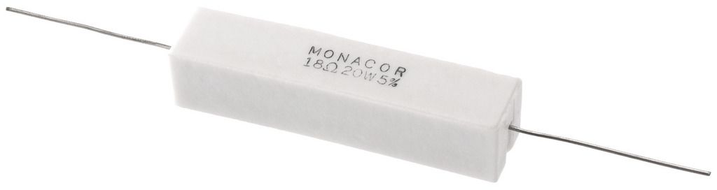 High-power cement resistor, 18 Ω, 20 W Resistor for use in crossover networks, especially for PA and top hi-fi applications, also to be connected as load resistors. Manufacturer information: MONACOR INTERNATIONAL GmbH & Co. KGKonsul-Smidt-Str....