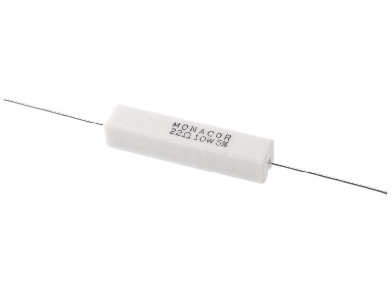 High-power cement resistor, 22 Ω, 10 W Resistor for use in crossover networks, especially for PA and top hi-fi applications, also to be connected as load resistors. Manufacturer information: MONACOR INTERNATIONAL GmbH & Co. KGKonsul-Smidt-Str....