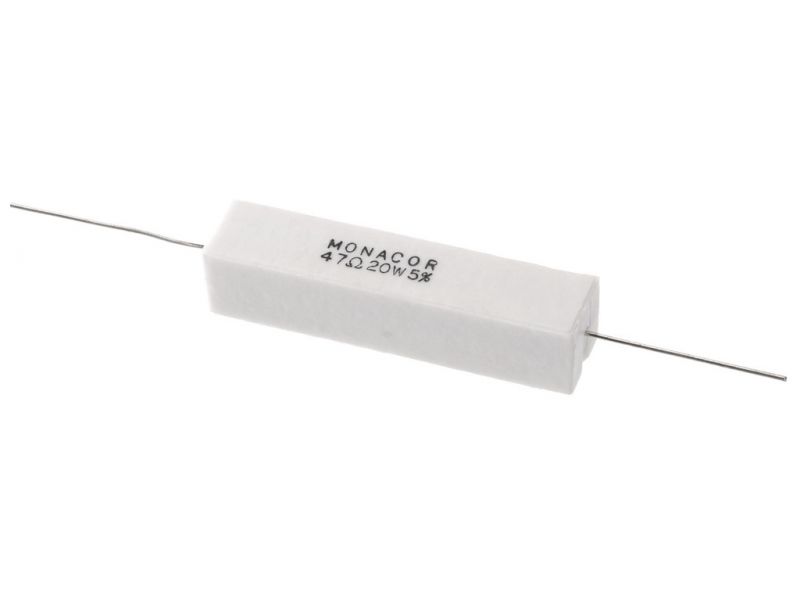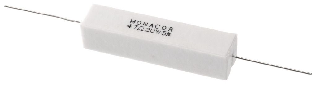 High-power cement resistor, 47 Ω, 20 W Resistor for use in crossover networks, especially for PA and top hi-fi applications, also to be connected as load resistors. Manufacturer information: MONACOR INTERNATIONAL GmbH & Co. KGKonsul-Smidt-Str....