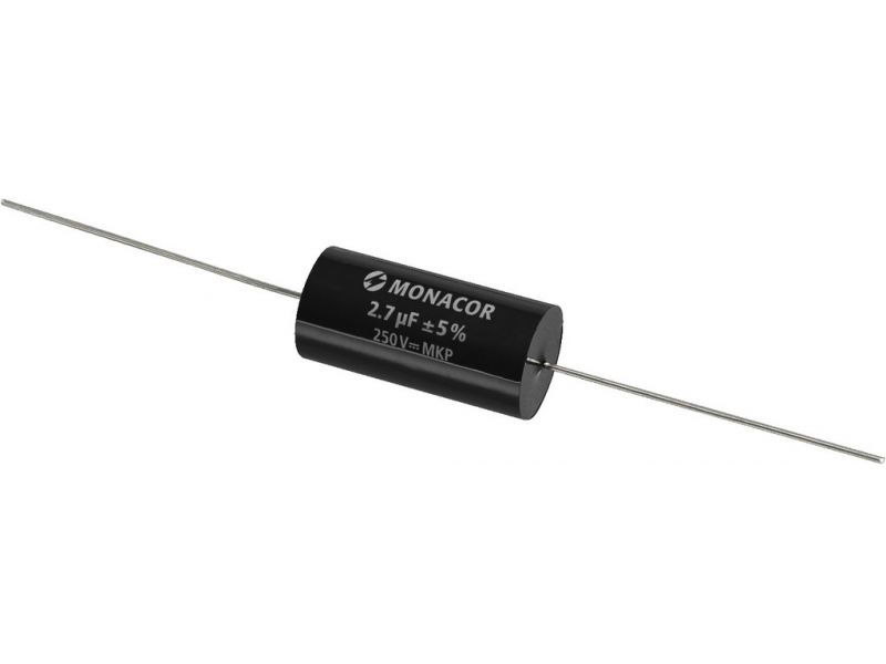 MKP film capacitor, 2.7 µF, 250 V Top-quality capacitor for high-end crossover networks Metal-coated polypropylene film Extra low loss factor Resistant to aging Axial design Manufacturer information: MONACOR INTERNATIONAL GmbH & Co. KGKonsul-Sm...