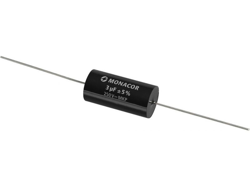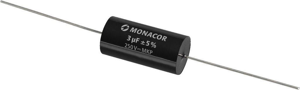 MKP film capacitor, 3.0 µF, 250 V Top-quality capacitor for high-end crossover networks Metal-coated polypropylene film Extra low loss factor Resistant to aging Axial design Manufacturer information: MONACOR INTERNATIONAL GmbH & Co. KGKonsul-Sm...