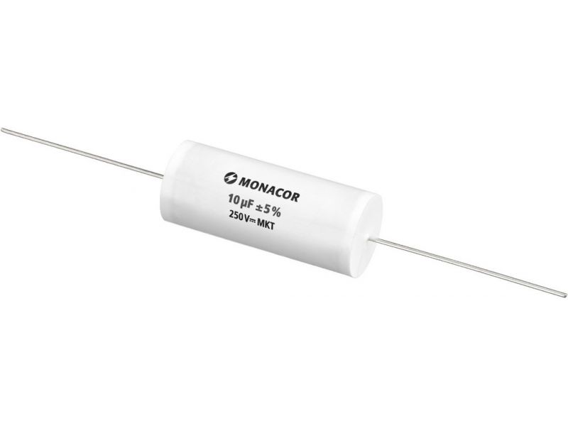 MKT film capacitor, 10 µF, 250 V Top-quality capacitor for high-quality crossover networks Metal-coated polyester film Extra low loss factor Resistant to aging Axial design Manufacturer information: MONACOR INTERNATIONAL GmbH & Co. KGKonsul-Smi...