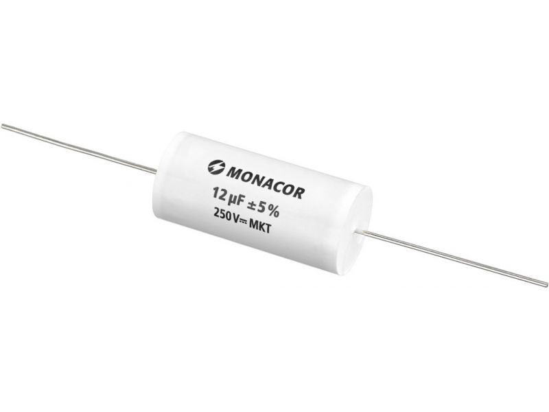 MKT film capacitor, 12 µF, 250 V Top-quality capacitor for high-quality crossover networks Metal-coated polyester film Extra low loss factor Resistant to aging Axial design Manufacturer information: MONACOR INTERNATIONAL GmbH & Co. KGKonsul-Smi...