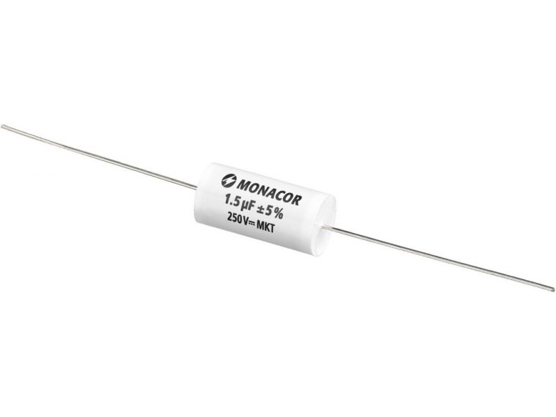 MKT film capacitor, 1.5 µF, 250 V Top-quality capacitor for high-quality crossover networks Metal-coated polyester film Extra low loss factor Resistant to aging Axial design Manufacturer information: MONACOR INTERNATIONAL GmbH & Co. KGKonsul-Sm...