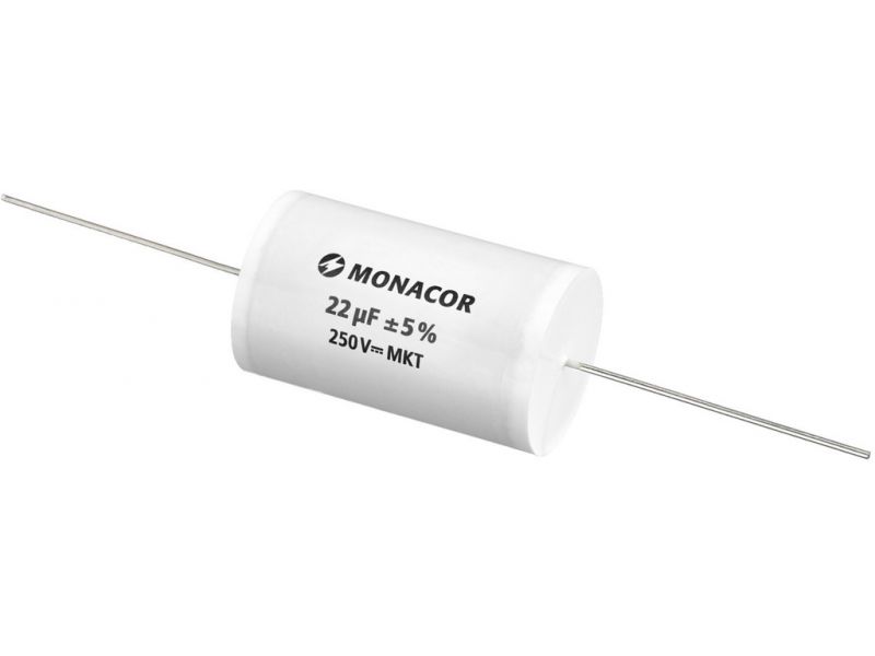 MKT film capacitor, 22 µF, 250 V Top-quality capacitor for high-quality crossover networks Metal-coated polyester film Extra low loss factor Resistant to aging Axial design Manufacturer information: MONACOR INTERNATIONAL GmbH & Co. KGKonsul-Smi...
