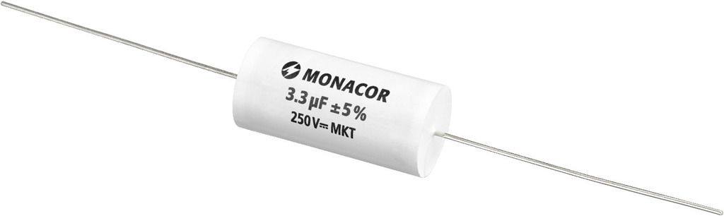 MKT film capacitor, 3.3 µF, 250 V Top-quality capacitor for high-quality crossover networks Metal-coated polyester film Extra low loss factor Resistant to aging Axial design Manufacturer information: MONACOR INTERNATIONAL GmbH & Co. KGKonsul-Sm...