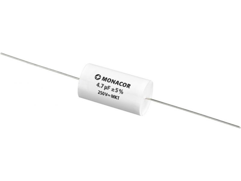 MKT film capacitor, 4.7 µF, 250 V Top-quality capacitor for high-quality crossover networks Metal-coated polyester film Extra low loss factor Resistant to aging Axial design Manufacturer information: MONACOR INTERNATIONAL GmbH & Co. KGKonsul-Sm...