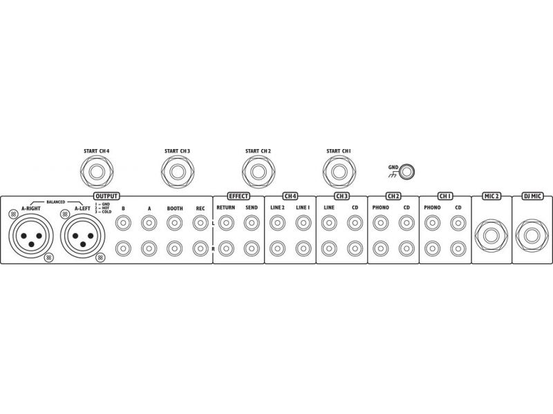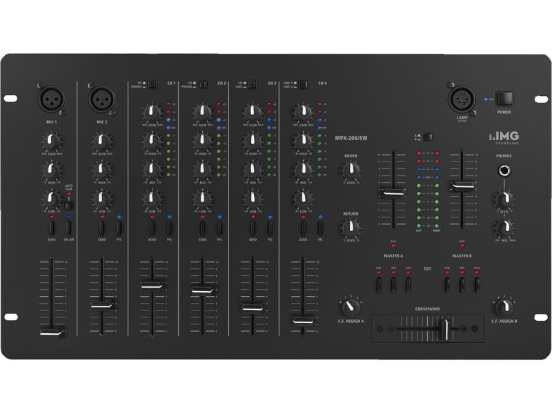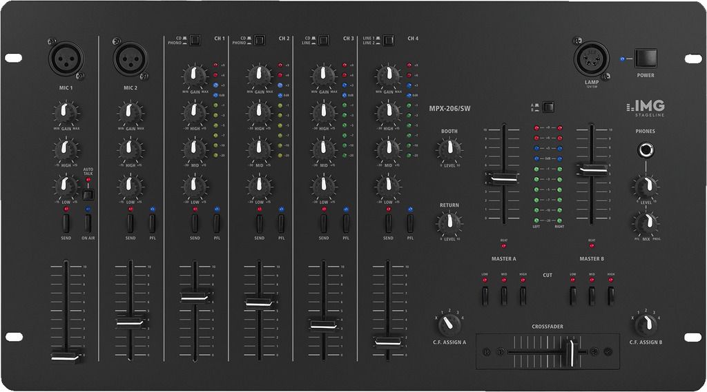 6-channel stereo mixer 4 stereo input channels, each with separate LED level display, switchable line/phono (channels 1-2) and line/line (channels 3-4), gain control, 3-way equalizer with cut function 1 DJ microphone channel with switchable automatic...