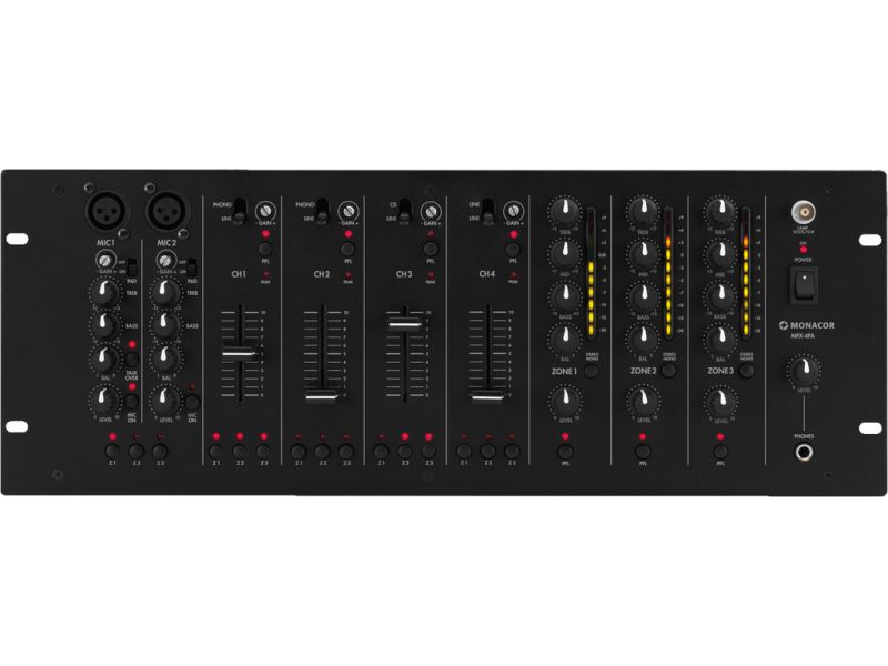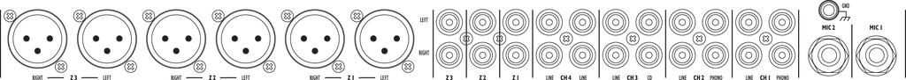 3-zone mixer 3 zones with user-defined routing of all input channels XLR and RCA zone outputs 6 input channels (4 stereo ways, 2 microphone ways) Both microphone ways can only be routed together Recessed gain control for each input channel Microphone...