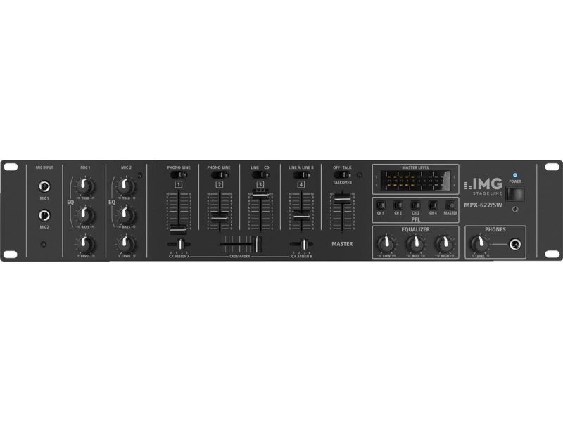 6-channel stereo audio mixer, specifically for PA and DJ applications. 2 mono microphone channels with talkover switch and 2-way tone control 4 stereo input channels, switchable phono/line (channels 1 and 2) or line/line (channels 3 and 4) 1 stereo...