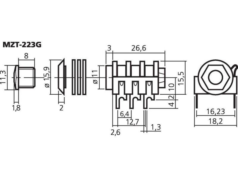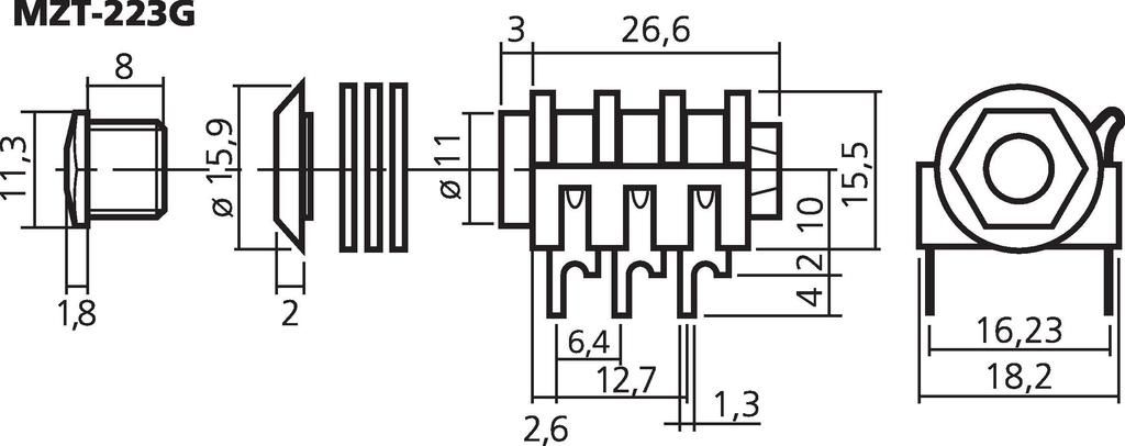 6.3 mm stereo panel jack 3 gold-plated switching contacts.