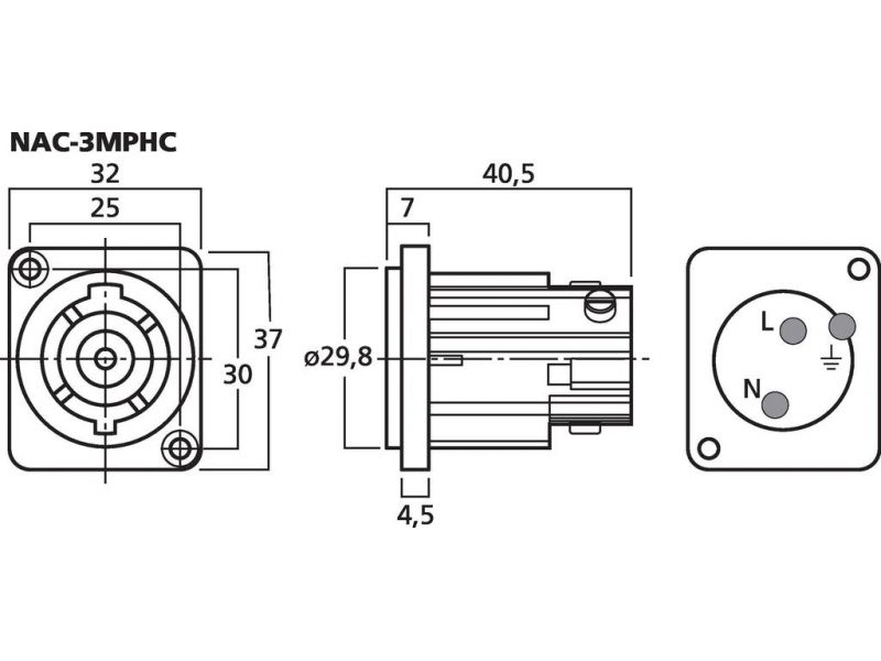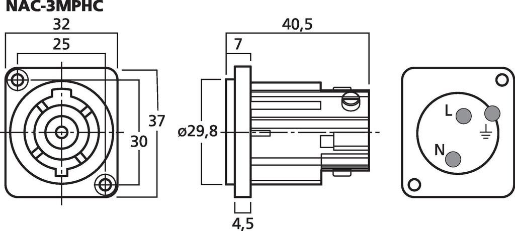 NEUTRIK POWERCON panel jack For mains connection with a high power rating of up to ˜ 250 V/32 A Screw terminal contacts for ground, phase and neutral connector For cable cores: 2.5-6 mm2 Manufacturer information: Neutrik AGIm alten Ried 1439494...