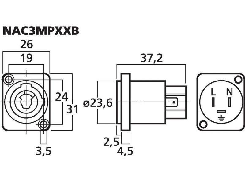NEUTRIK POWERCON panel jack For mains connection up to ˜ 250 V/20 A Version for mains output Connections for ground, phase and neutral connector Self-extinguishing according to UL-94 V-0 Manufacturer information: Neutrik AGIm alten Ried 1439494...