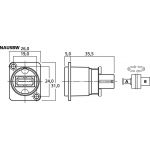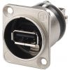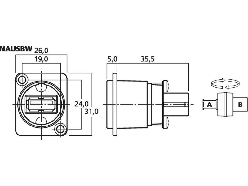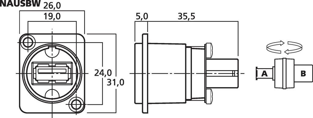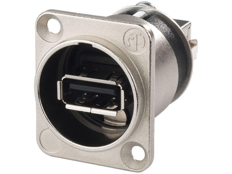 USB feed-through panel jack, nickel-plated, for integrating computer-based devices into audio and video systems as well as for audio networks like M-LAN, Cobra Net, etc. Reversible adapter for feed-through direction: Type-A/Type-B or Type-B/Type-A...