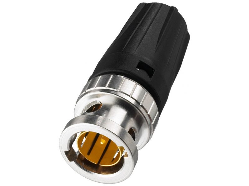 BNC plugs, 75 Ω For cables: Ø 6.3 mm High-quality PTFE insulation Gold-plated contacts Centre pin for crimping