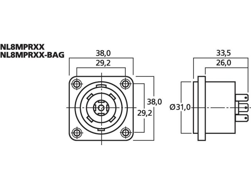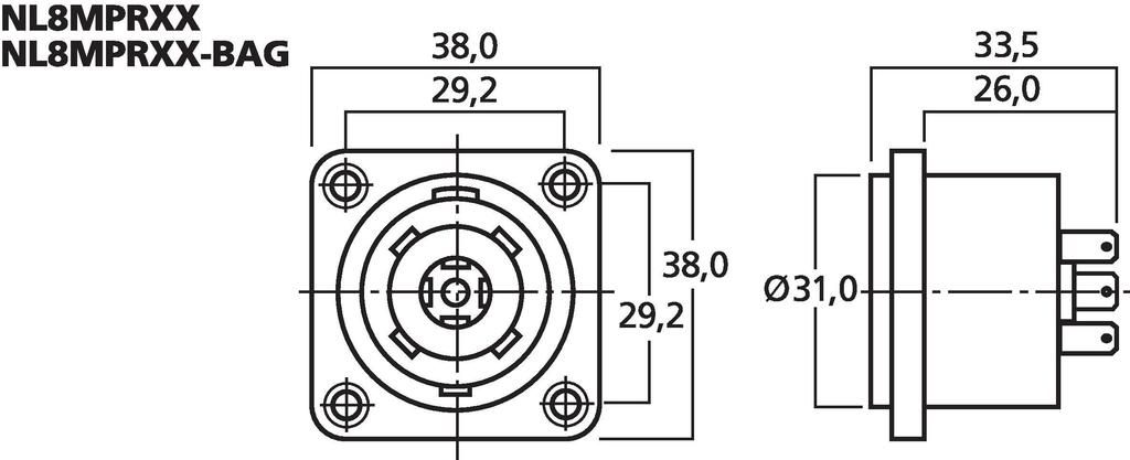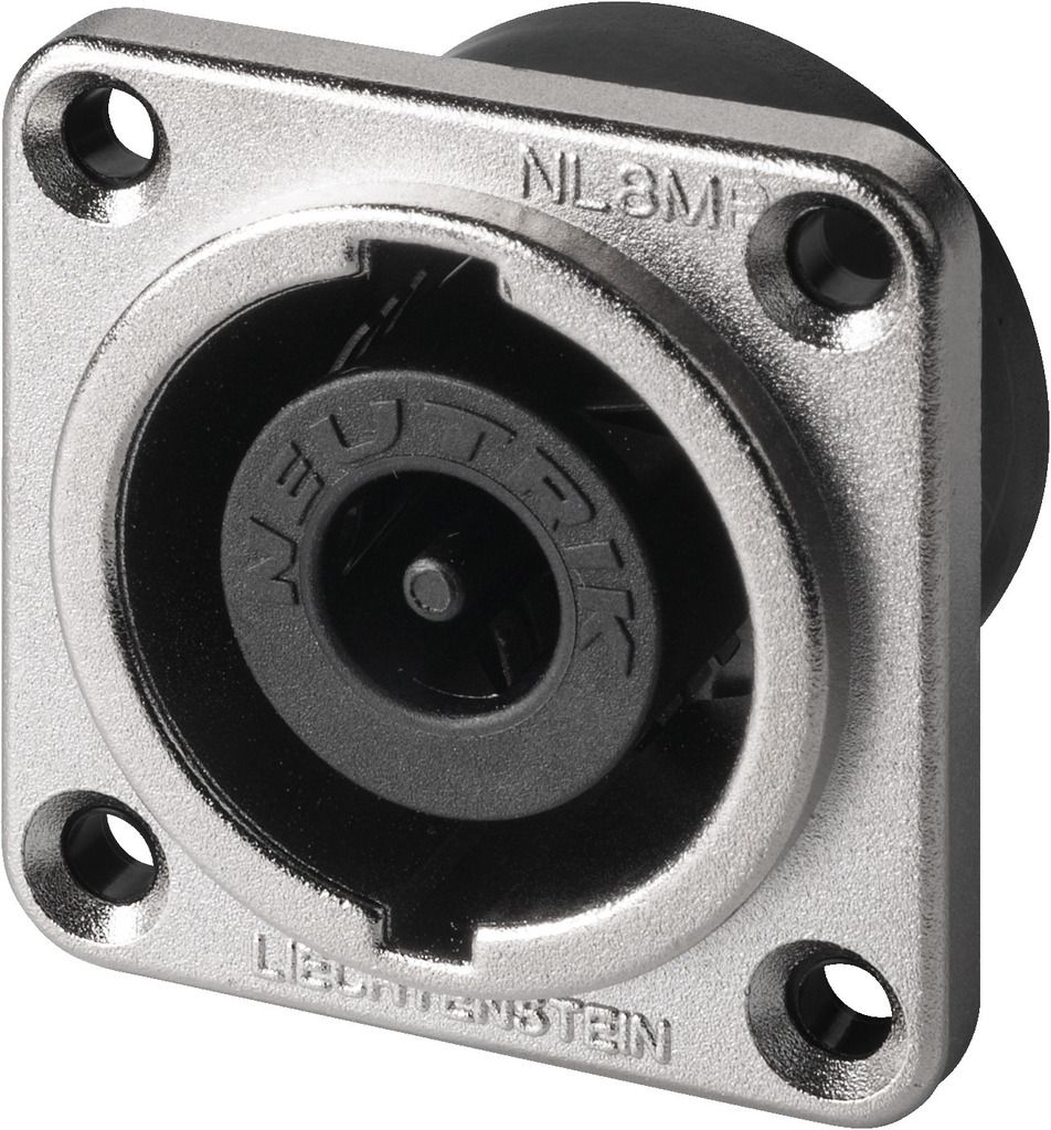 NEUTRIK SPEAKON panel jack 8 poles Plastic Large square version With nickel-plated metal plate for extra high stability Manufacturer information: Neutrik AGIm alten Ried 1439494 SchaanLiechtensteinneutrik@neutrikgroup.com