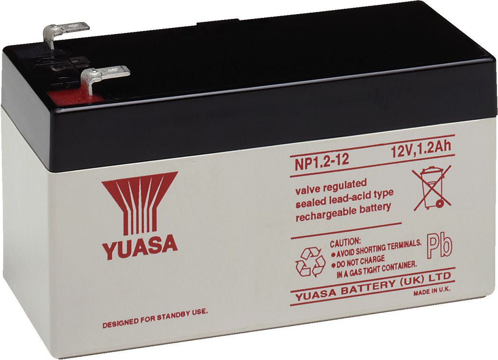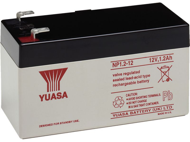 Rechargeable lead battery, 12 V, 1.2 Ah, by YUASA. Maintenance-free Extra high capacity For general use Discharging or storing in any position For standby parallel operation (SBPO) and cycle operation (CO) 3-5 years service life in standby paralle...