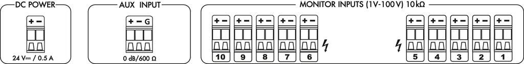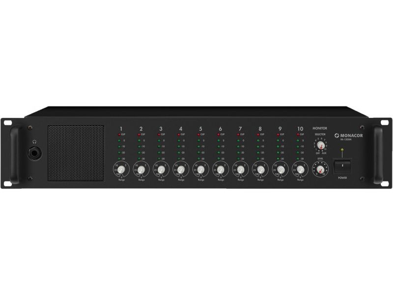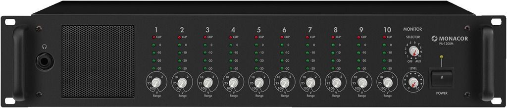 Monitor unit, 10 + 1 channels Audio sources can be selected via rotary switch 10 monitor inputs 1-100 V/10 kΩ 1 aux input 0 dB (0.775 V)/600 Ω Level control, LED VU meter and clip LED for each monitor input Built-in 2 W speaker, volume control Headph...