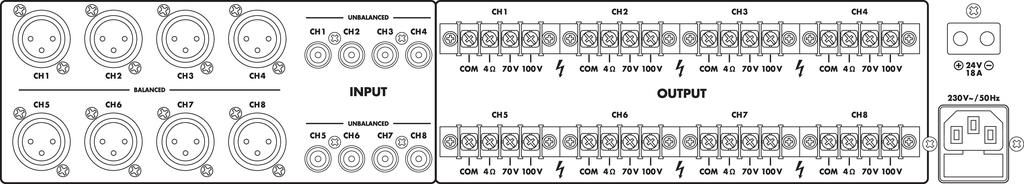 | Power rating at 70 V | 8 x 50 W |