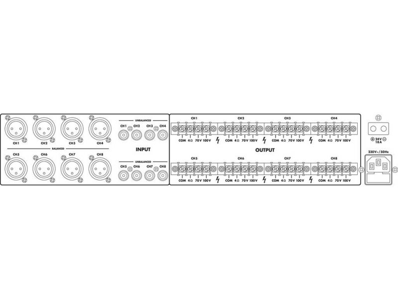 | Connections | 8 x XLR input, bal. 8 x RCA input, screw contacts (speakers) |