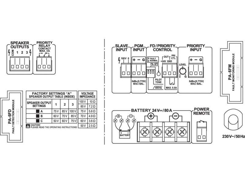 | Output impedance | 75 V/5.6 Ω, 85 V/7.2 Ω, 100 V/10 Ω |