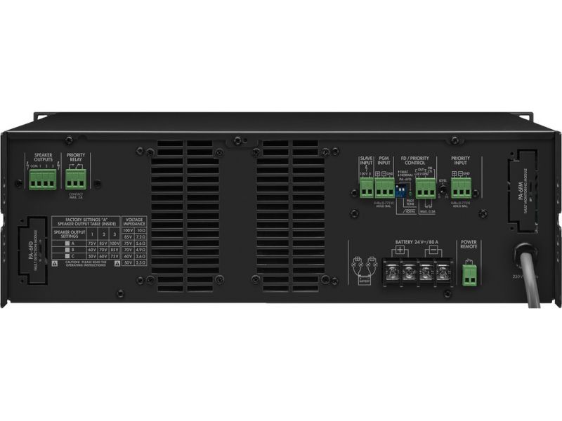 High-power mono PA amplifier 1 x 960 W Additional, adjustable priority input with switchable priority function 100 V slave input for inserting the amplifier into a 100 V speaker line Switchable 400 Hz high-pass filter 6 dB/oct. 2 insertion facilities...
