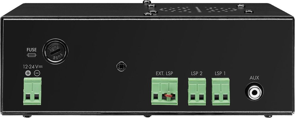 | Connections | 1 x 6.3 mm jack (mic input), 1 x RCA (line input), 2 x 2-pole plug-in screw terminal (speakers), 1 x 3-pole plug-in screw terminal with jumper (external speakers) |