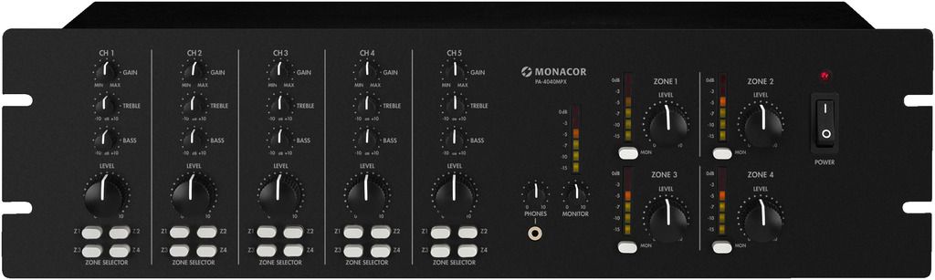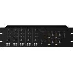 4-zone mixer, for general multi-room PA applications. 4 zones with user-defined routing of all input channels 3 inputs microphone/line via comb. jacks 2 inputs line stereo via RCA jacks Each input channel with gain control, 2-way tone control and z...