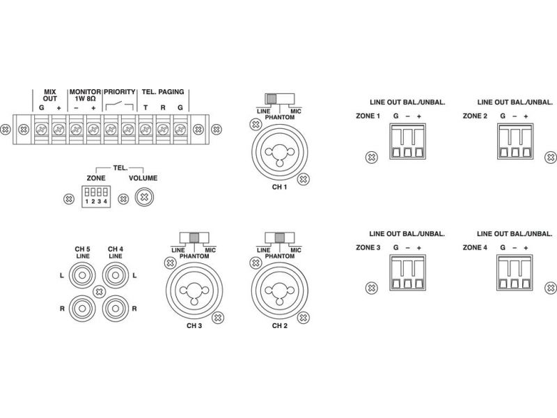| Connections | 3 x combo 6.3 mm/XLR (mic/line), 2 x RCA L/R (line), 4 x plug-in screw terminal (zones), screw contacts (monitor speakers), screw contacts (mix out), screw contacts (paging), screw contacts (priority) |