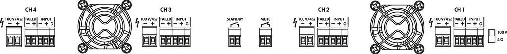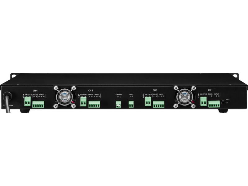 4-channel class D PA power amplifier 4 x 120 W Class D concept with a high efficiency to cut energy costs Temperature-controlled fan, continuously adjustable Connection for external on/off switch Connection for external mute switch LED indication for...